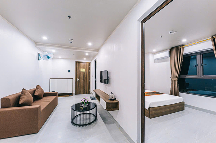 Mỗi căn phòng đều được thiết kế tinh tế, diện tích rộng rãi từ 33–46m², tối ưu ánh sáng tự nhiên với cửa sổ lớn hướng biển hoặc quảng trường. Không gian phòng luôn thoáng đãng, mang lại cảm giác thư thái ngay khi bước vào.